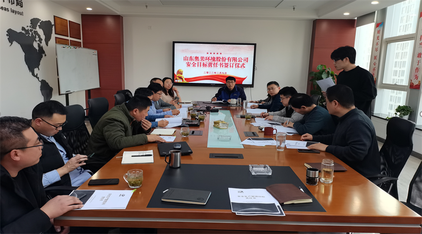 会议由公司安全生产部组织,公司领导班子及各部门负责人参加。尚瑞董事长宣读《山东3044am永利安全生产承诺书》并带头在承诺书上签字,窦大河总监宣读《山东奥美安全生产目标管理责任书》相关内容,强调公司安全、环保、职业卫生否决指标,工作要求,奖惩办法。马总和李总以及各部门负责人签订责任书。